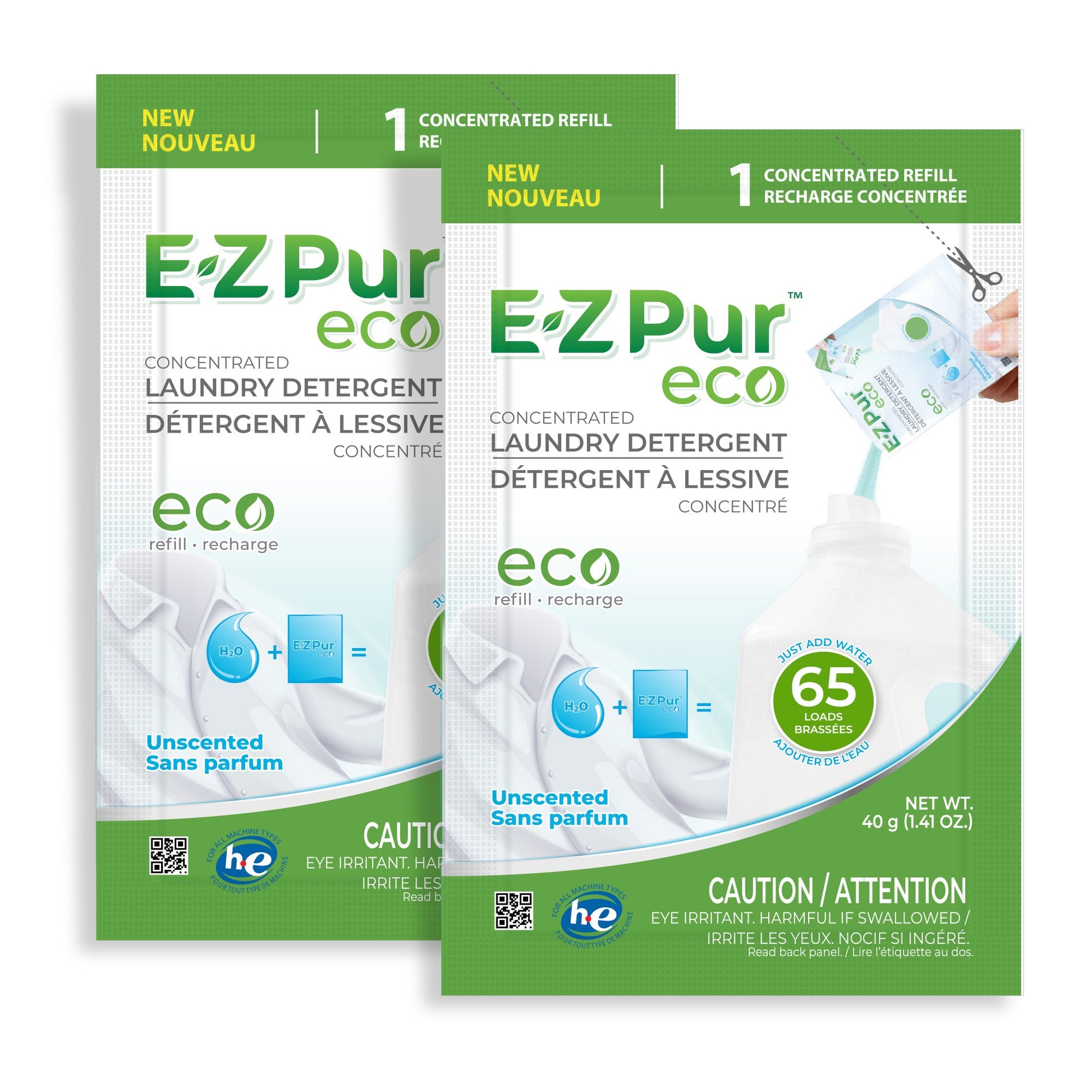 Each EZ Pur Eco Laundry Detergent Concentrate offers convenient, eco-friendly cleaning power in a tiny, lightweight pouch that can be mixed at home with water using an empty laundry detergent jug. This new eco-concentrated formula offers heavy-duty cleaning power for even the dirtiest of clothes.