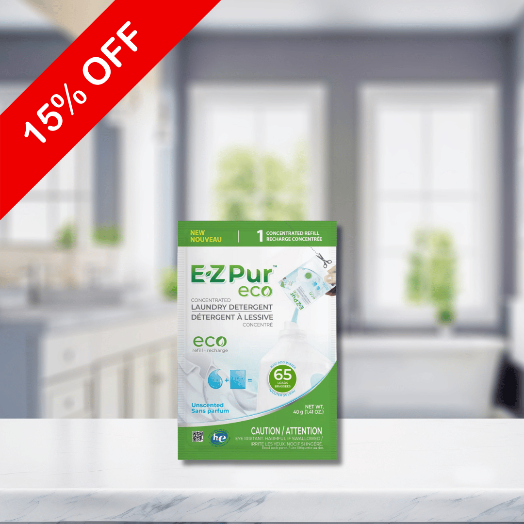 Each EZ Pur Eco Laundry Detergent Concentrate offers convenient, eco-friendly cleaning power in a tiny, lightweight pouch that can be mixed at home with water using an empty laundry detergent jug. This new eco-concentrated formula offers heavy-duty cleaning power for even the dirtiest of clothes.