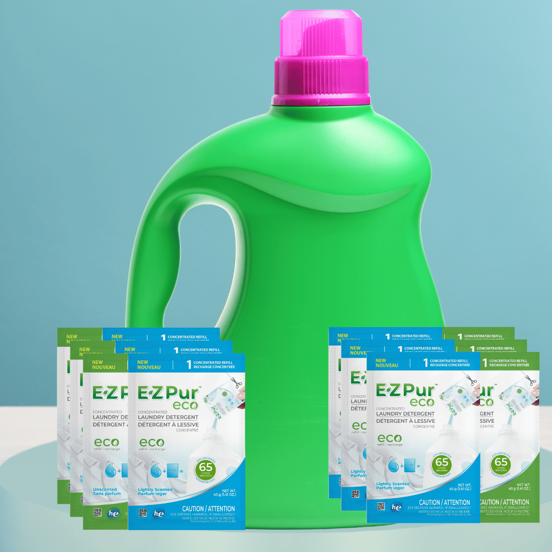 Each EZ Pur Eco Laundry Detergent Concentrate offers convenient, eco-friendly cleaning power in a tiny, lightweight pouch that can be mixed at home with water using an empty laundry detergent jug. This new eco-concentrated formula offers heavy-duty cleaning power for even the dirtiest of clothes.